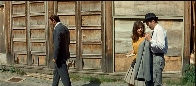 Over the languid, churning strings of Georges Delerue's brooding, original score, under the steep, angle of a high sun burnishing the earthen-colored stucco walls, laying them bare and ablaze with scant relief of stark shade, the long tracking shots, the crack of gravel underfoot, and with back-and-forth conversations often repeated by a character translating between languages, the scenes shot outside the Cinecitta Studio buildings are heavy with afternoon heat.